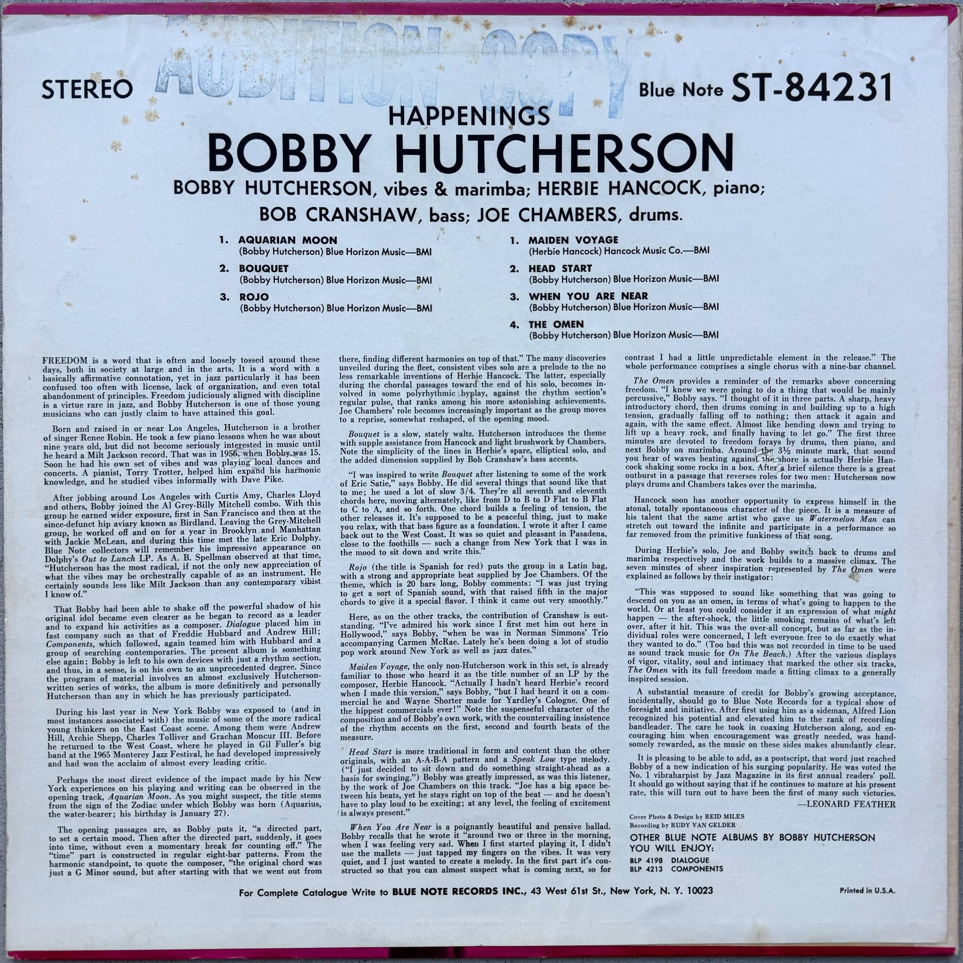 SPECS: 1ST PRESSING; 1967; STEREO; NO DG; NYNY; VAN GELDER; AUDITION COPY; NO P; NO LAM.